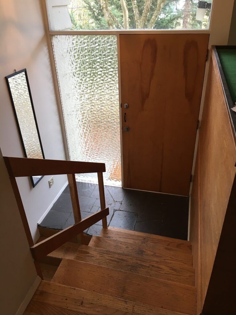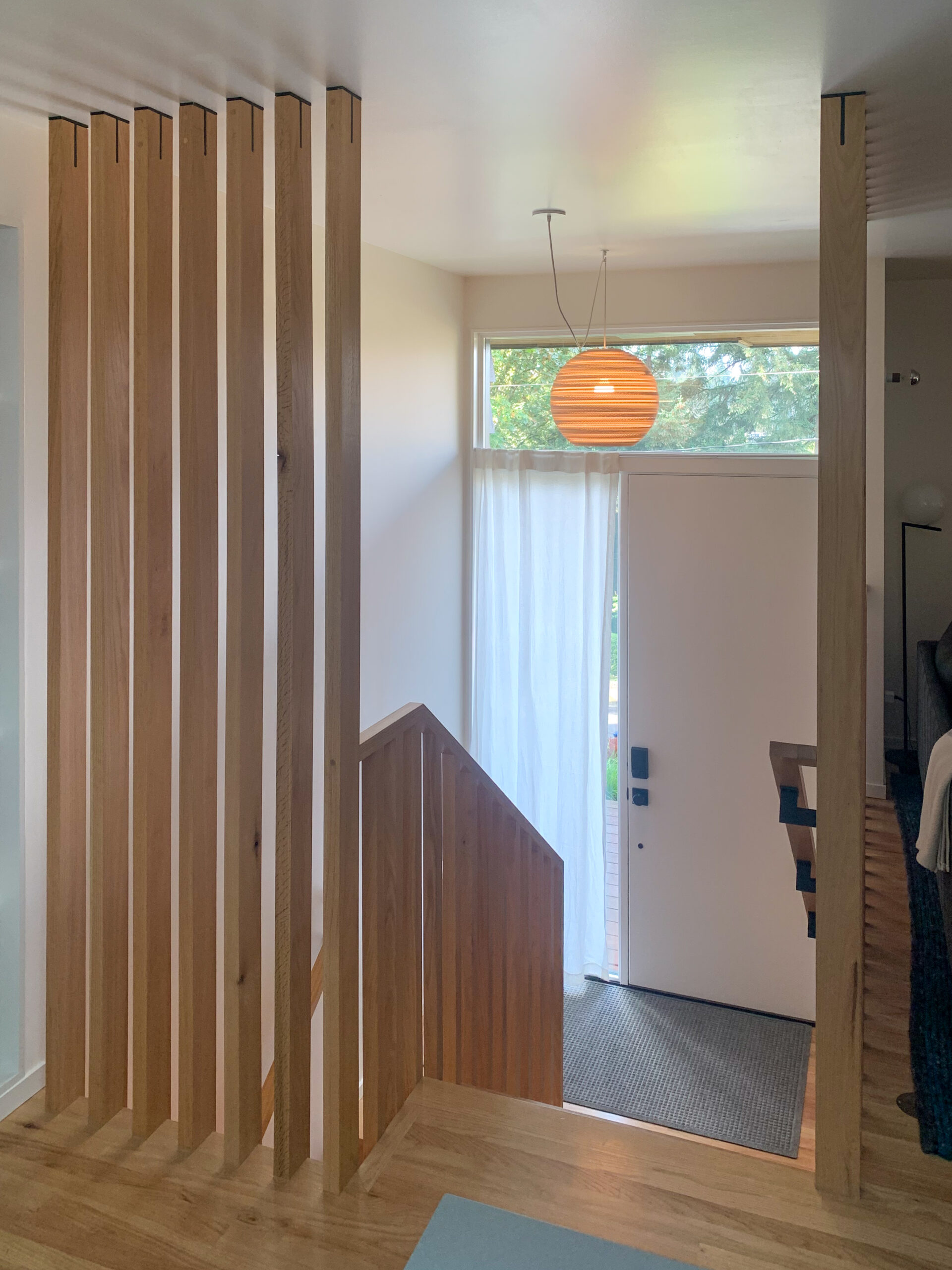 • The entry way was opened up to provide better flow between the levels, but a wood screen element still provides some privacy from the street.